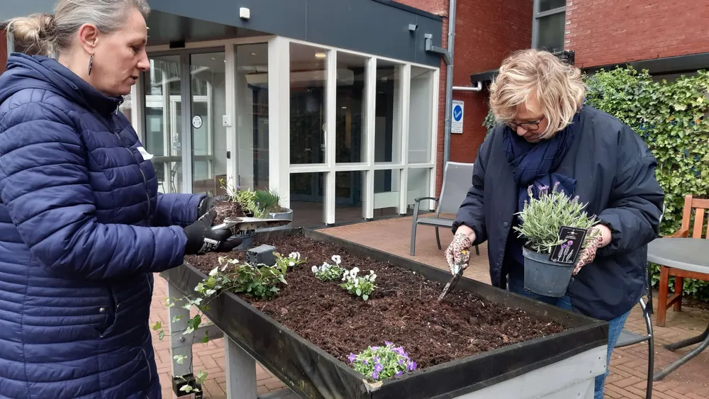 Ook bewoners helpen mee tijdens Nldoet. Samen met vrijwilligers en medewerkers vullen zij kweekbakjes. Daarnaast kunnen alle bewoners genieten van versgebakken poffertjes. Zo wordt het voor iedereen een feestelijke dag.